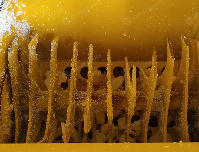 傾斜投料斗一便于投 EPS 物料,二物料不會在破碎過程中將物料推出料斗。發(fā)泡聚苯乙烯的熱熔回收 機用破碎刀,平行放置的刀軸,刀軸上對稱地固定有刀片,刀軸上的刀片相互錯位排列,并且每根 刀軸上的相鄰刀片以相同方向錯開一定角度排列于刀軸上。物料破碎后用電機帶螺桿壓出成塊。